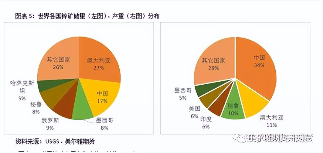 據(jù)美國地質(zhì)勘探局(USGS)2021年的報(bào)告顯示,全球已探明的鋅資源量為19億噸,鋅礦儲(chǔ)量為2.5億金屬噸。其中澳大利亞的鋅礦儲(chǔ)量最為豐富,約占到全球總儲(chǔ)量的27%。中國鋅礦儲(chǔ)量僅排名第二,約占全球總量的17%。其次分別為俄羅斯(占全球的9%)、墨西哥(8%)、秘魯(8%)、哈薩克斯坦(5%)等國。